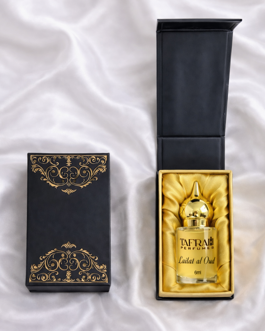 Dark, smoky, and quietly powerful from the first moment. The richness of oud meets the elegance of rose, softened by whispers of incense and saffron. As it settles, benzoin and warm woods create a resinous depth that feels mysterious, composed, and undeniably luxurious.