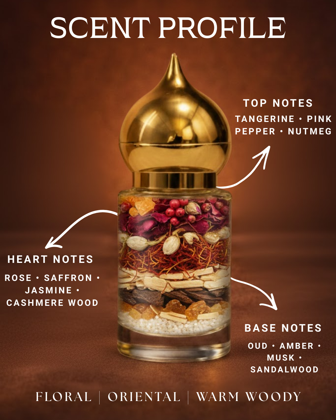 Heart Notes – Rose , Saffron , Jasmine , Cashmere Wood