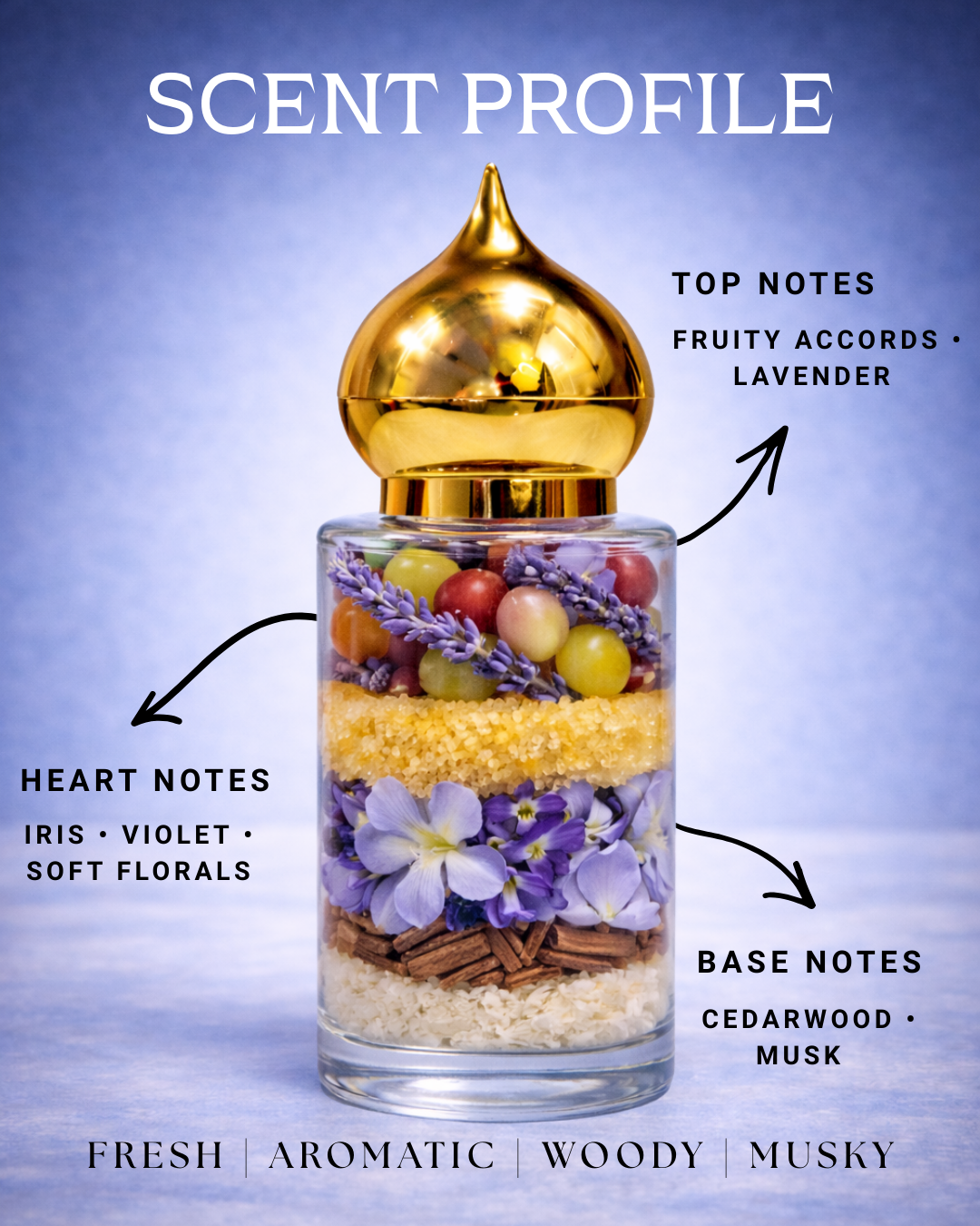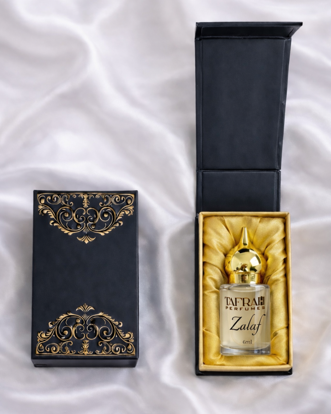 Zalaf opens with a sparkling, clean burst of fruits and aromatic lavender — fresh, uplifting, and smooth. As it settles, a creamy, slightly powdery floral heart emerges, adding elegance without heaviness. The drydown reveals musky woods that feel warm, composed, and effortlessly sophisticated — leaving a trail that feels polished rather than loud.